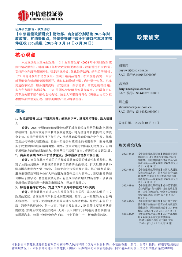【中信建投证券】【20250331】2025年财政政策、扩消费重点及特朗普签署行政令对进口汽车及零部件征收25%关税-15页
