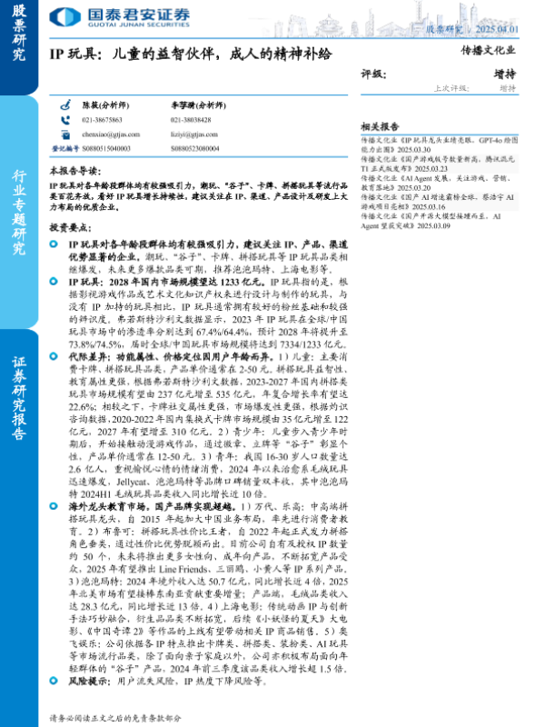 【国泰君安证券】【20250401】传播文化行业IP玩具:儿童的益智伙伴,成人的精神补给-26页