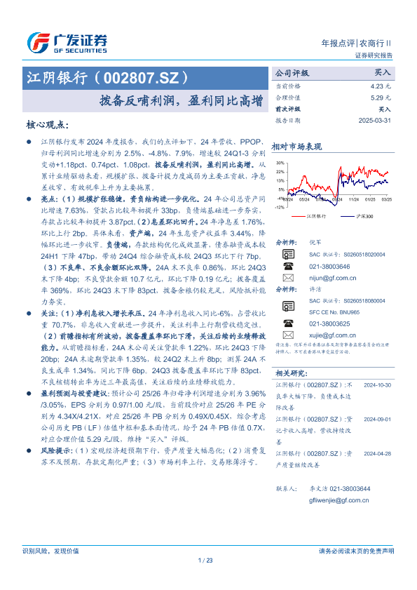【广发证券】【20250331】江阴银行(002807.SZ)拨备反哺利润,盈利同比高增-23页