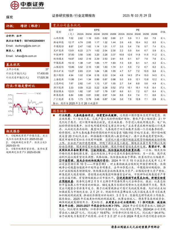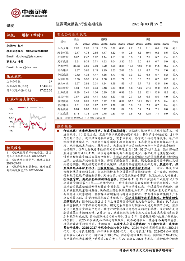 【中泰证券】【20250329】煤炭行业:春检将至供需宽松或缓解,关注龙头白马配置机会-23页