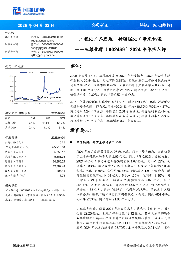 【国海证券】【20250402】三维化学2024年年报点评:工程化工齐发展,新疆煤化工带来机遇-12页