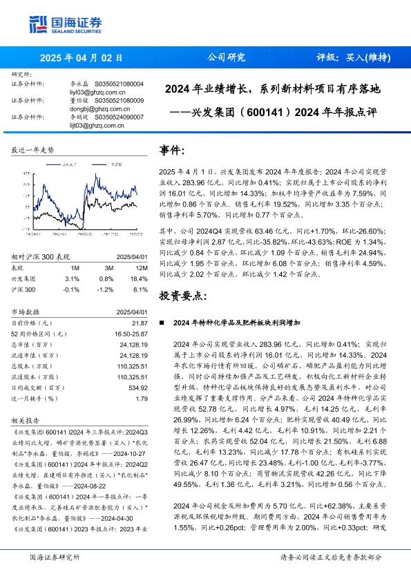 【国海证券】【20250402】兴发集团2024年年报点评:2024年业绩增长,系列新材料项目有序落地-13页