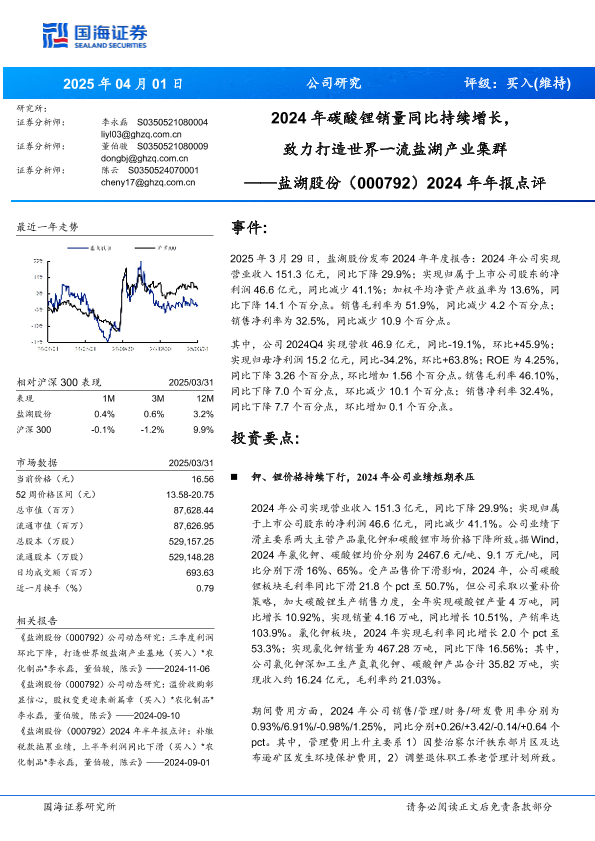 【国海证券】【20250401】2024年年报点评:2024年碳酸锂销量同比持续增长,致力打造世界一流盐湖产业集群-13页