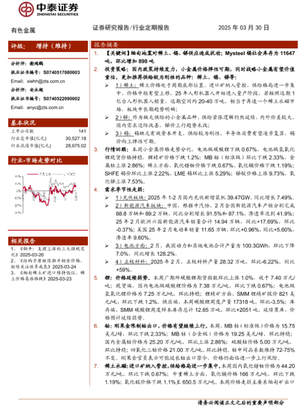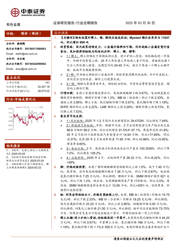 【中泰证券】【20250330】有色金属行业:小金属供给扰动增加-26页