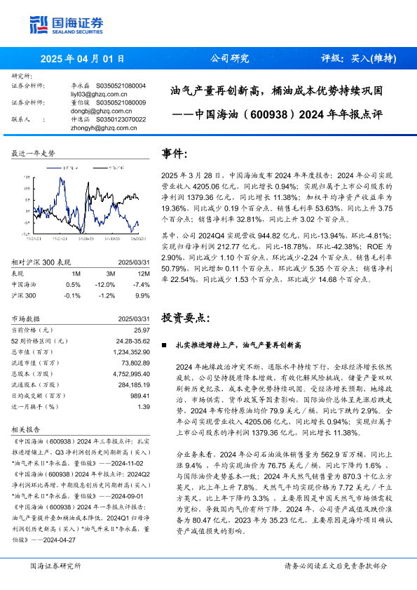 【国海证券】【20250401】中国海油2024年年报点评:油气产量再创新高,桶油成本优势持续巩固-11页