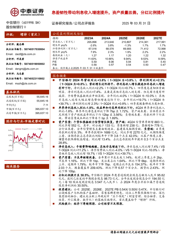 中信银行 分红比例 利息收入 息差韧性 资产质量
