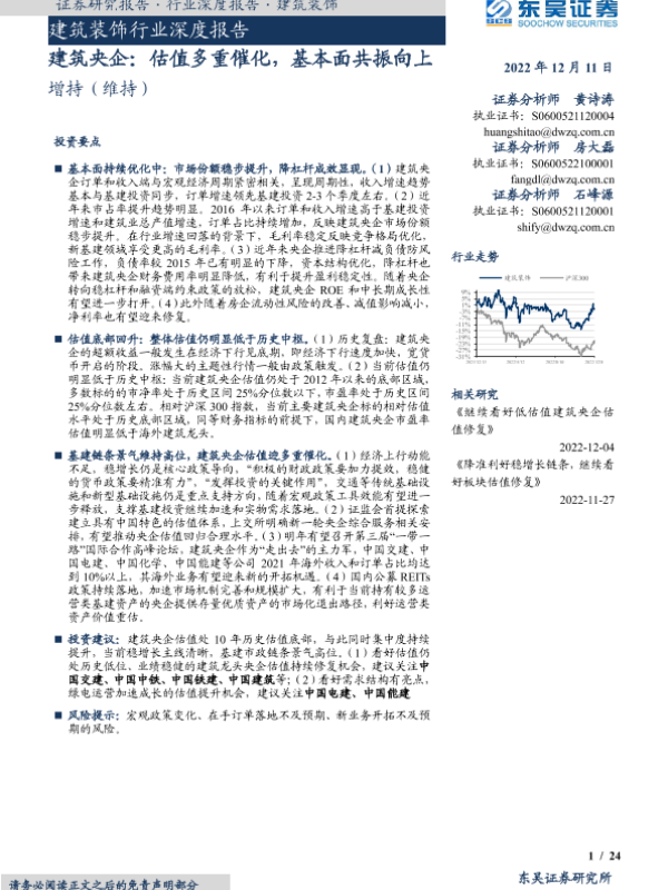 【东吴证券】【20221211】建筑装饰行业深度报告:建筑央企,估值多重催化,基本面共振向上-24页