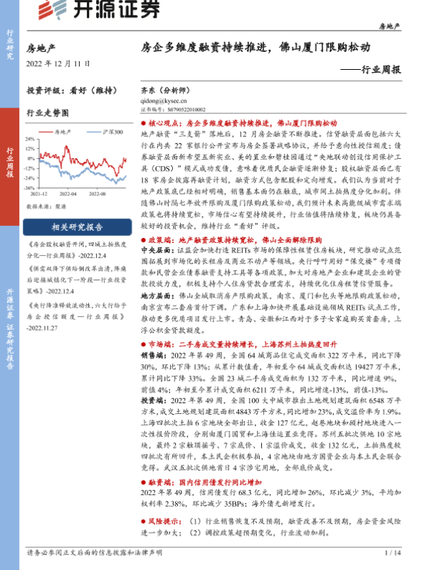 【开源证券】【20221211】房地产行业周报:房企多维度融资持续推进,佛山厦门限购松动-14页