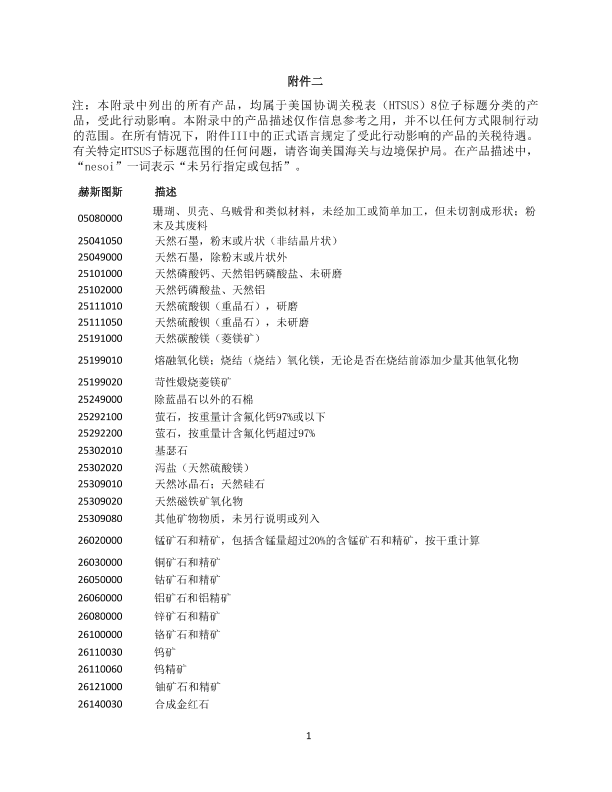 产品清单 关税豁免 国际贸易 矿产品 美国政策