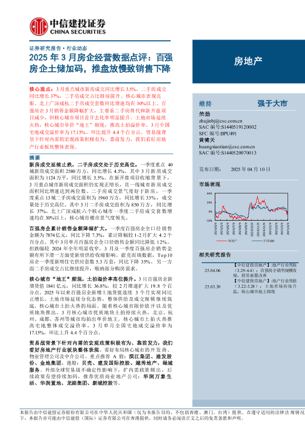 【中信建投证券】【20250410】2025年3月房企经营数据点评:百强房企土储加码,推盘放慢致销售下降-13页