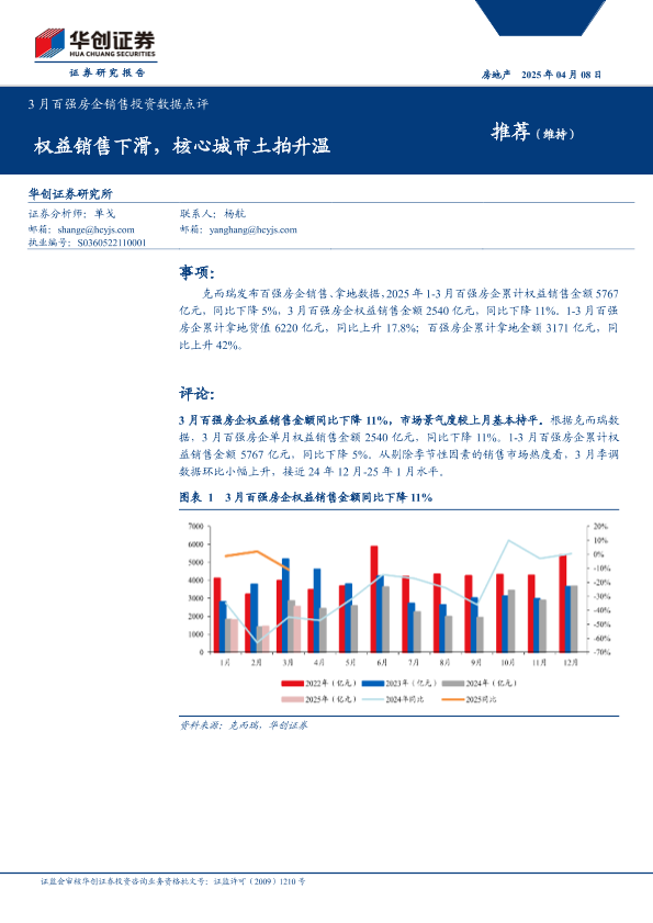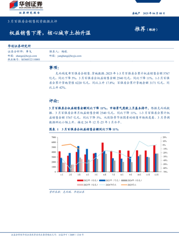 【华创证券】【20250408】3月百强房企销售投资数据点评:权益销售下滑,核心城市土拍升温-12页