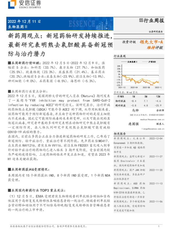 【安信证券】【20221211】新药周观点:新冠药物研发持续推进,最新研究表明熊去氧胆酸具备新冠预防与治疗潜力-15页