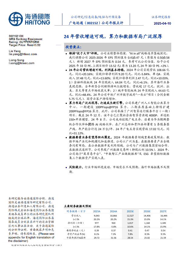 【海通国际】【20250409】广电运通(002152)24年营收增速可观,算力和数据布局广泛深厚-11页