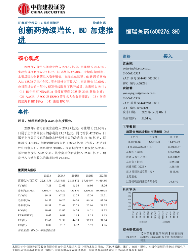 【中信建投证券】【20250406】恒瑞医药创新药持续增长,BD加速推进-12页