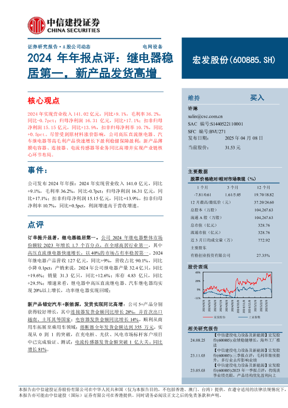 【中信建投证券】【20250408】宏发股份2024年年报点评-14页