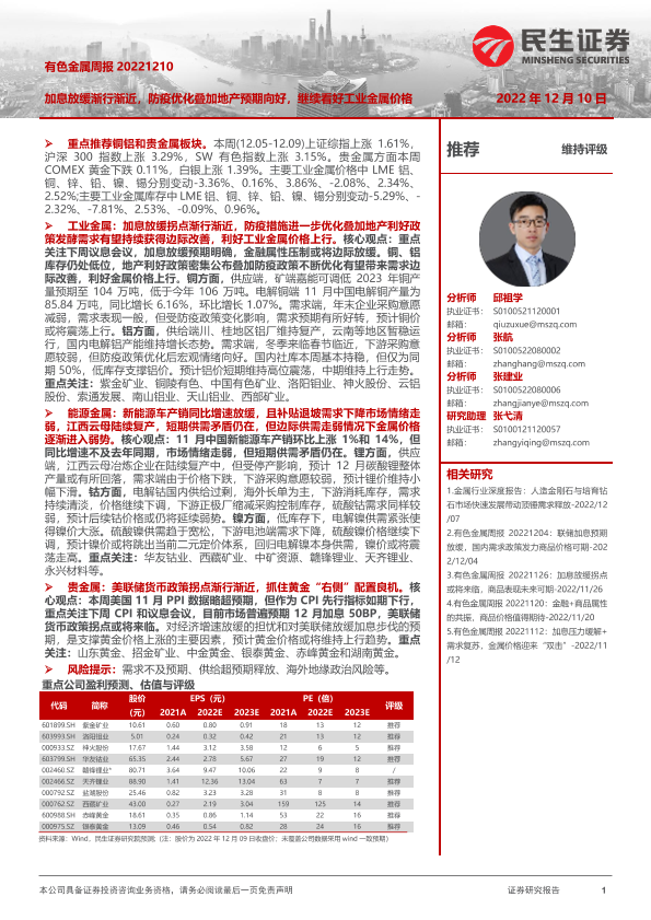 【民生证券】【20221210】有色金属周报:加息放缓渐行渐近,防疫优化叠加地产预期向好,继续看好工业金属价格-26页