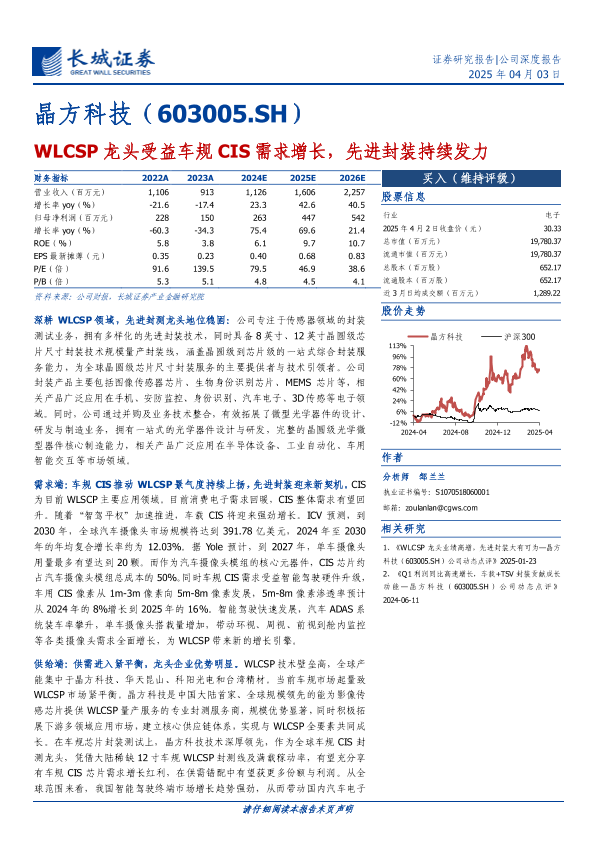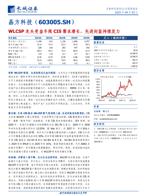 【长城证券】【20250403】晶方科技(603005)WLCSP龙头受益车规CIS需求增长,先进封装持续发力-27页