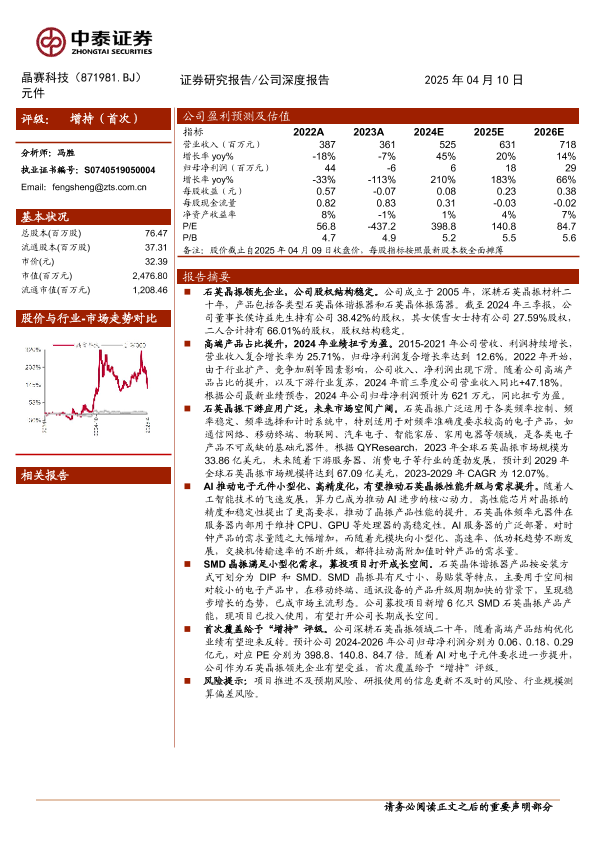 【中泰证券】【20250410】晶赛科技(871981)石英晶振领先企业,AI算力驱动晶振元件升级-20页