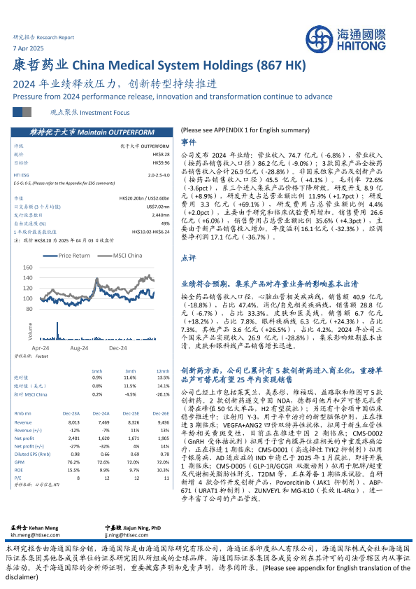 【海通国际】【20250407】康哲药业(00867.HK)2024年业绩释放压力,创新转型持续推进-13页