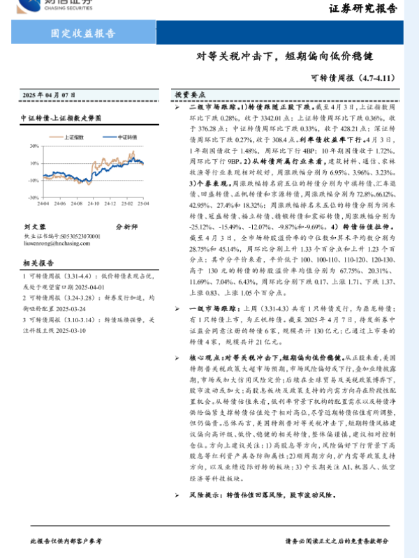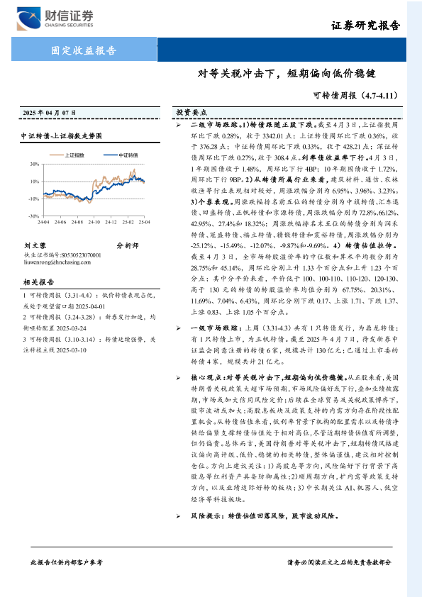 【财信证券】【20250407】可转债:对等关税冲击下,短期偏向低价稳健-10页