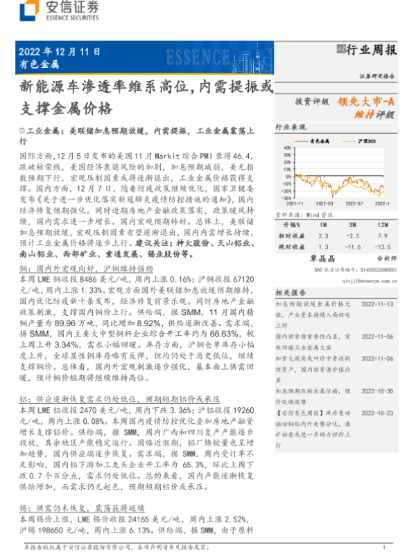【安信证券】【20221211】有色金属行业周报:新能源车渗透率维系高位,内需提振或支撑金属价格-18页