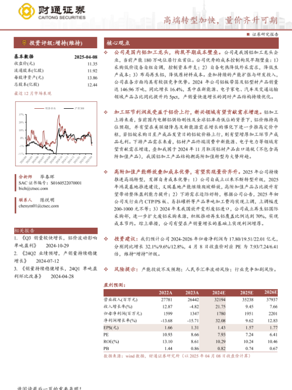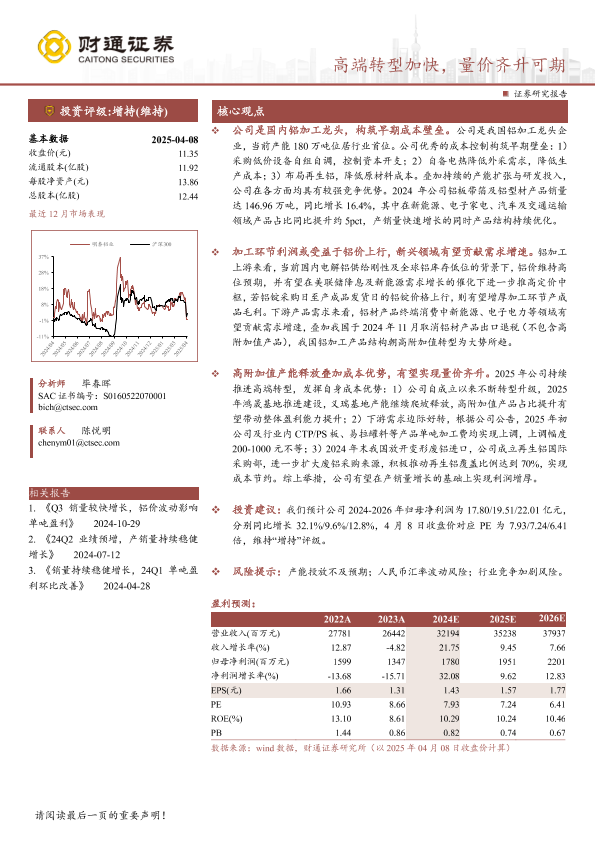 市场需求 成本优势 财务预测 铝加工 高端转型