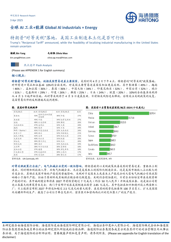 【海通国际】【20250403】全球AI工业+能源行业:特朗普“对等关税”落地,美国工业制造本土化是否可行性-10页