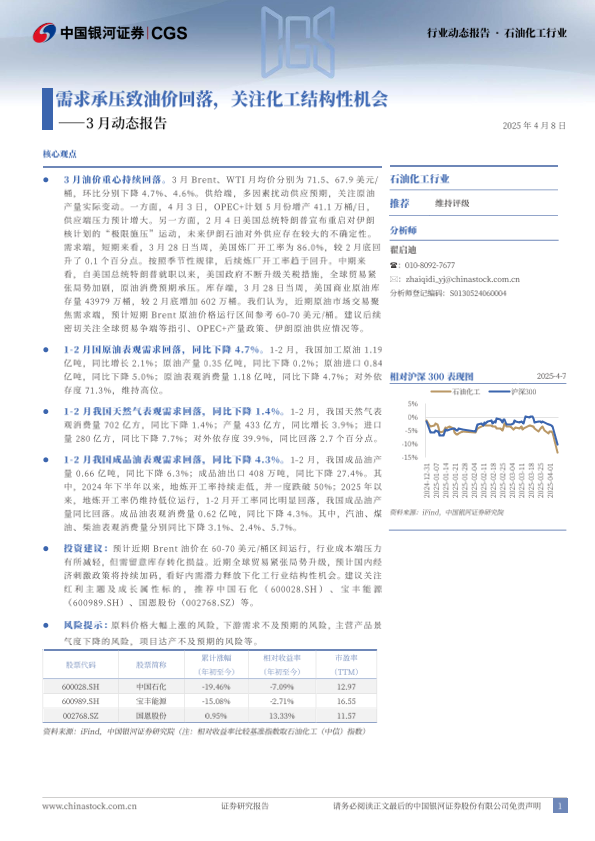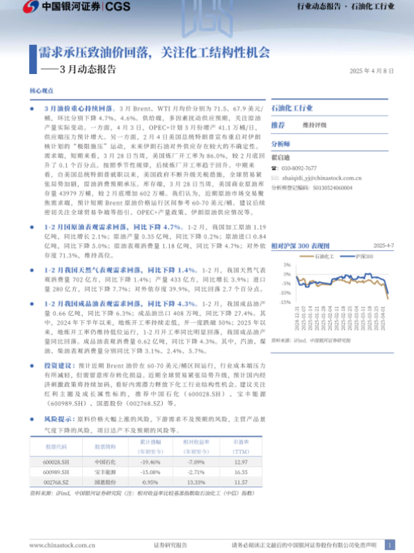 【银河证券】【20250408】石油化工行业3月动态报告:需求承压致油价回落,关注化工结构性机会-21页
