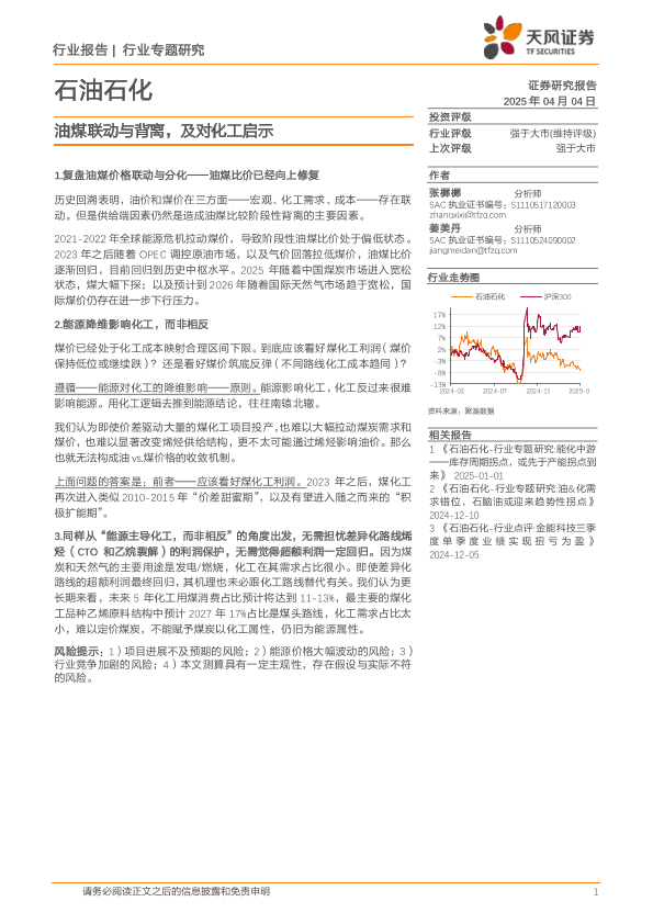【天风证券】【20250404】石油石化行业专题研究:油煤联动与背离,及对化工启示-14页
