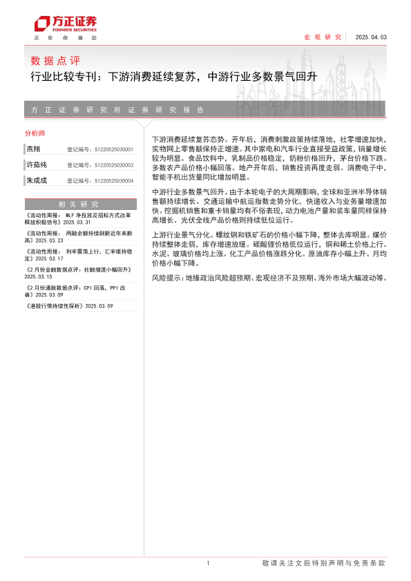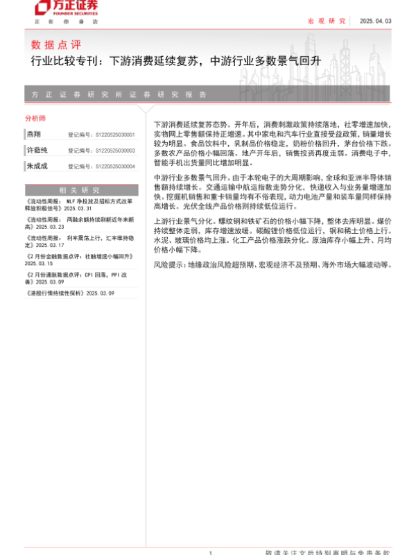 【方正证券】【20250403】数据点评-行业比较专刊:下游消费延续复苏,中游行业多数景气回升-20页