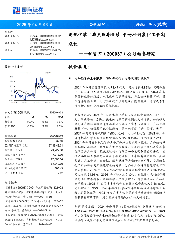 【国海证券】【20250406】新宙邦(300037)公司动态研究:电池化学品拖累短期业绩,看好公司氟化工长期成长-10页
