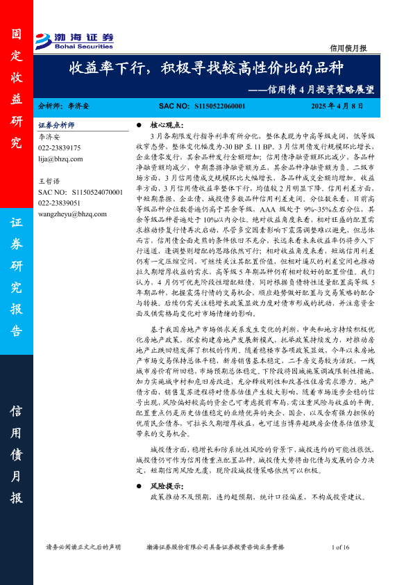【渤海证券】【20250408】信用债4月投资策略展望:收益率下行,积极寻找较高性价比的品种-16页