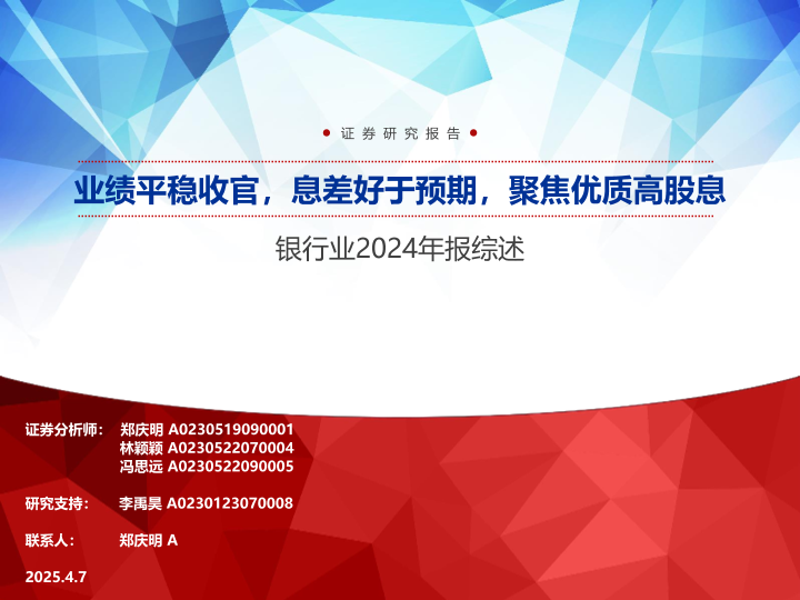 【申万宏源】【20250407】银行业2024年报综述:业绩平稳收官,息差好于预期,聚焦优质高股息-37页