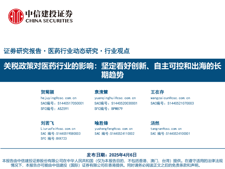 【中信建投证券】【20250406】医药行业关税政策对医药行业的影响:坚定看好创新、自主可控和出海的长期趋势-35页