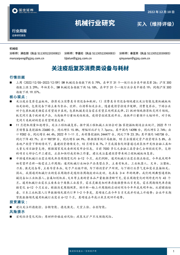 【国金证券】【20221210】机械行业周报:关注疫后复苏消费类设备与耗材-17页