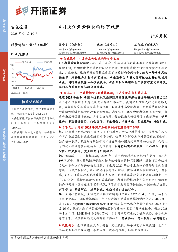 【开源证券】【20250410】有色金属行业月报:4月关注黄金板块的防守效应-23页