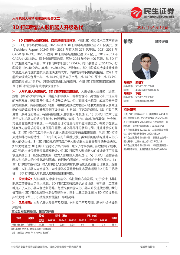 【民生证券】【20250410】有色金属行业人形机器人材料需求系列报告之二:3D打印赋能人形机器人升级迭代-41页