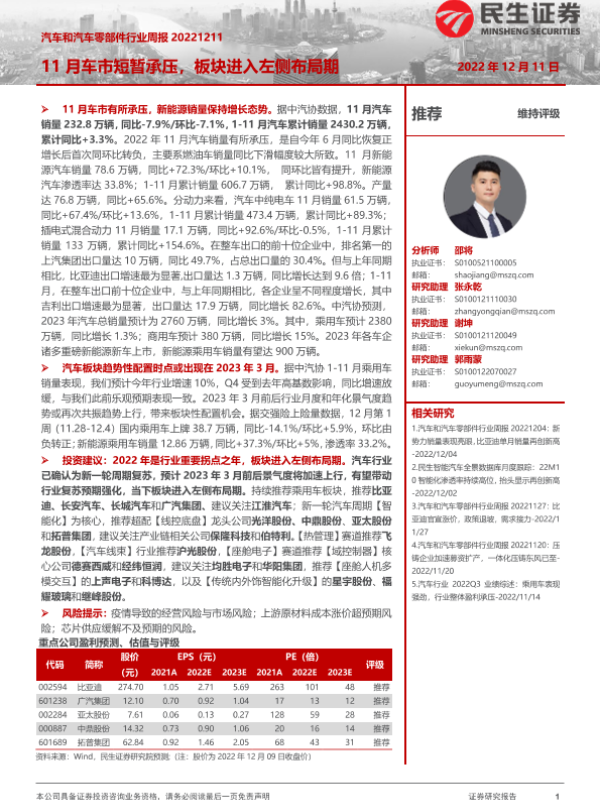 【民生证券】【20221211】汽车和汽车零部件行业周报:11月车市短暂承压,板块进入左侧布局期-20页