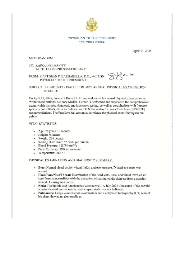 【CAPT SEAN P. BARBABELLA, D.O., MC, USN PHYSICIAN TO THE PRESIDENT】【20250413】PRESIDENT DONALD J. TRUMP'S ANNUAL PHYSICAL EXAMINATION RESULTS-3页
