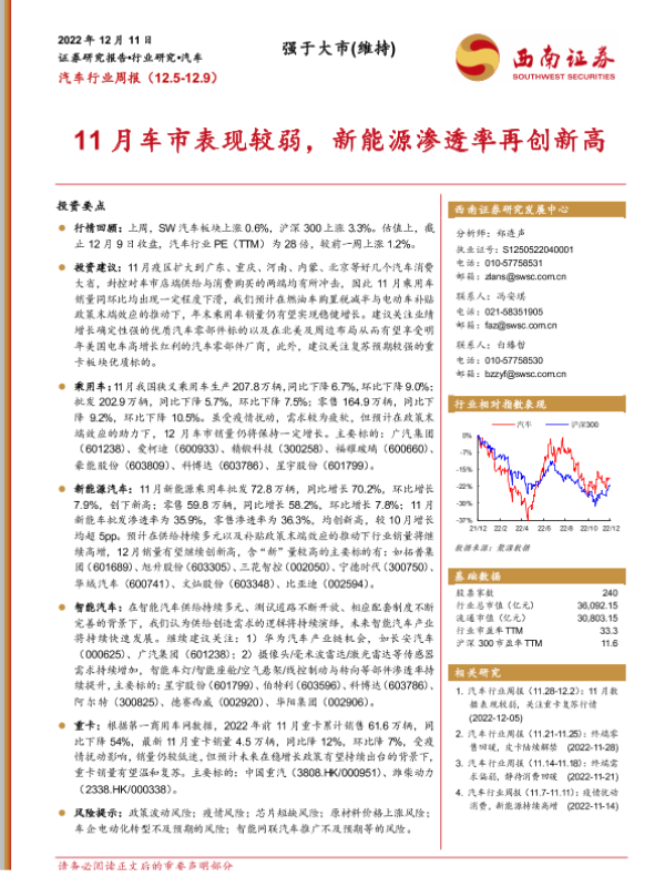 【西南证券】【20221211】汽车行业周报:11月车市表现较弱,新能源渗透率再创新高-16页