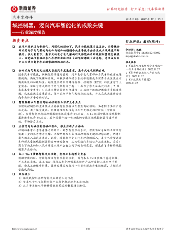 【浙商证券】【20221213】汽车零部件行业深度报告:域控制器,迈向汽车智能化的成败关键-26页