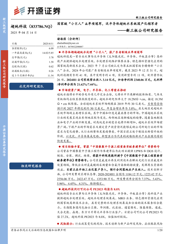 【开源证券】【20250414】超纯科技(833786)新三板公司研究报告:国家级“小巨人”&单项冠军,泛半导体超纯水系统国产化领军者-20页
