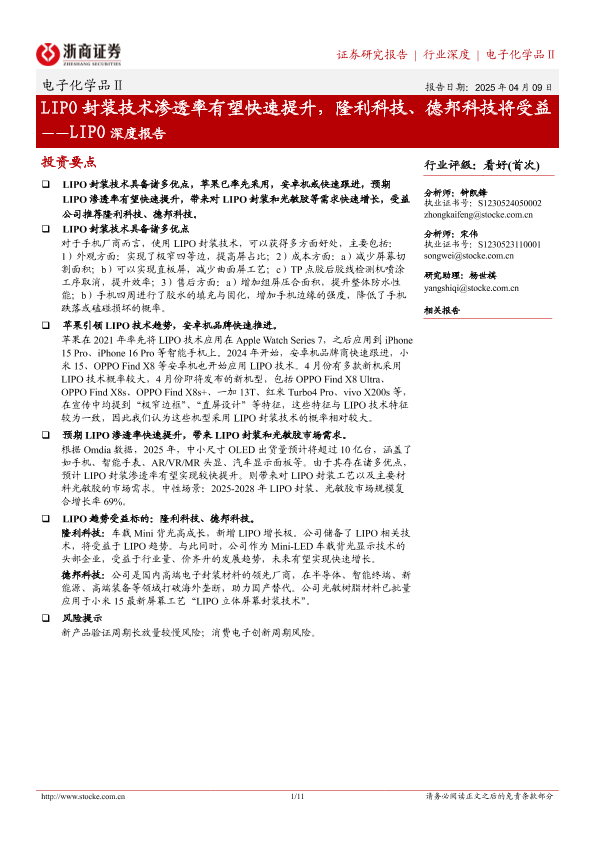 【浙商证券】【20250409】电子化学品行业LIPO深度报告:LIPO封装技术渗透率有望快速提升,隆利科技、德邦科技将受益-11页
