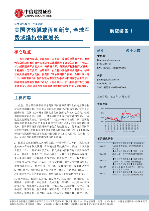 【中信建投证券】【20250413】航空装备Ⅱ行业动态:美国防预算或再创新高,全球军费或维持快速增长-23页