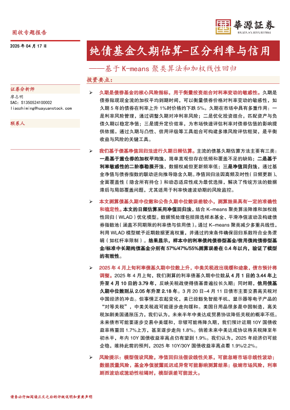 【华源证券】【20250417】基于K-means聚类算法和加权线性回归:纯债基金久期估算,区分利率与信用-17页