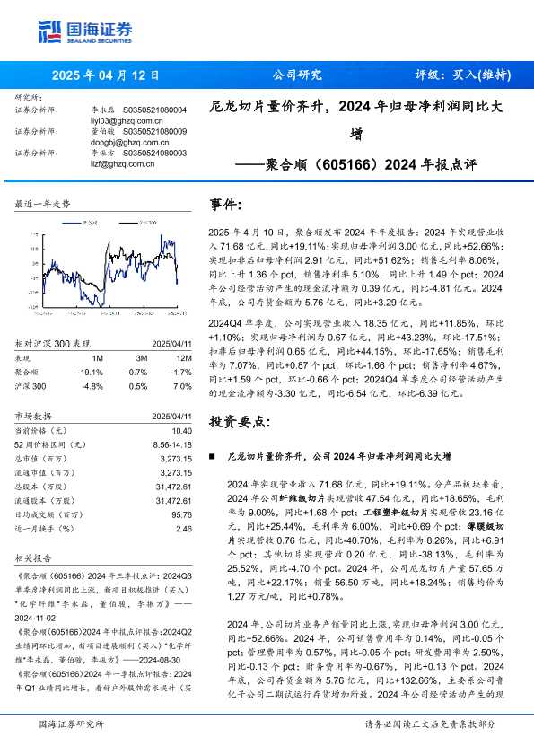 【国海证券】【20250412】聚合顺2024年报点评:尼龙切片量价齐升,2024年归母净利润同比大增-11页