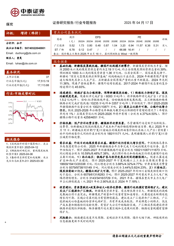 【中泰证券】【20250417】煤炭行业:运力扩容价优凸显,疆煤外运蓄势待增-21页