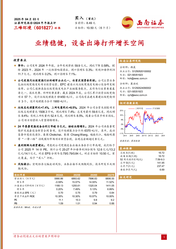 【西南证券】【20240403】三峰环境2024年年报点评:业绩稳健,设备出海打开增长空间-12页