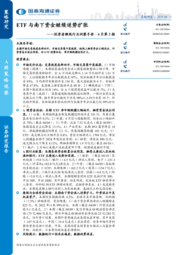 【国泰海通证券】【20250413】投资者微观行为洞察手册·4月第3期:ETF与南下资金继续逆势扩张-33页