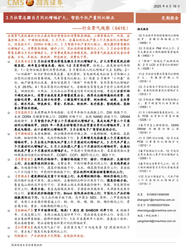 【海通证券】【20250416】行业景气观察:3月社零总额当月同比增幅扩大,智能手机产量同比转正-38页